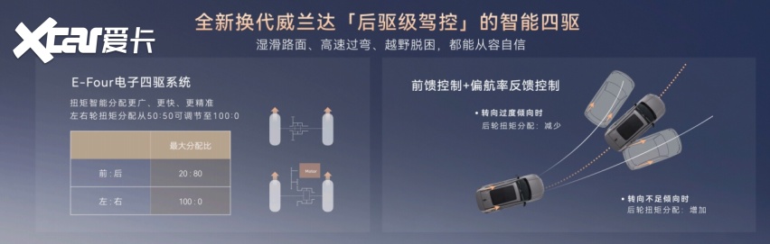 当所有油车发布都在大肆说智能化的当下,换代威兰达重新把少数人提及的机械素质摆上桌面。全新威兰达E-FOUR电子四驱可以罕见实现前后轴驱动力100:0-20:80的智能调节,动力系统通过对四驱系统和悬挂的智能调控,让这台城市SUV在保持舒适的同时,具备了超越同级的操控稳定性和通过性,过弯更灵活、脱困更迅速。应用全新ECB电子控制制动系统,轮上扭矩分配更快更精准,大幅优化侧倾控制,实现了更线性跟脚的制动脚感,显著缩短制动距离,过弯更稳。基于TNGA增强型K增强平台,换代威兰达车身刚性提升9.7%,关键悬挂安装点刚性提升超30%,面对非铺装路面也能大幅提升车身抗扭性,在过弯时也能提供更坚实的支撑。作为丰田第五代混动首款四驱车型,换代威兰达以丰田全球水准底盘调校,在智能协同四驱、悬架、制动的情况下,带来了燃油车操控性能天花板级的表现,无论城区还是野外,带来全天候、全地形的从容自信,威兰达让每一次驾驭都充满信心与乐趣,带来“下一代油车”该有的机械素质。